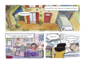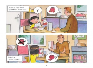 A la lumière de l’actualité récente concernant un ministre et des salariées, l’illettrisme est au cœur des débats. Papa ne sait pas permet donc chez les enfants de le prolonger. 2,5 millions d’adultes en France ne savent ni lire ni écrire ni compter ; des savoirs fondamentaux. Epris d’un forme de gêne voire de honte, ils dissimulent aux gens qui les entourent ou au reste du monde ce handicap. Dans l’album, le papa trouve des astuces pour le contourner, demande à sa femme de l’aider dans les tâches administratives de son entreprise. Sans jamais accabler ces personnes, le récit d’Alain Dary et Bastien Griot est bienveillant. Comme lorsque Capucine voudra l’aider à apprendre à lire ou lorsque son ancienne institutrice lui transmettra les coordonnées d’une association qui vient en aide aux adultes en difficulté. L’idée même des scénaristes de faire un parallèle entre une élève de CP qui est apprenante et un adulte illettré est extrêmement intéressante. Comme si chacun allait pouvoir apprendre en même temps que l’autre. A plusieurs, la difficulté est plus facilement surmontable. Moitié BD, moitié album illustré, ce bel ouvrage, qui peut se lire tête-bêche, a donc pour vocation de sensibiliser les plus jeunes au phénomène de l’illettrisme en France. Le trait tout en rondeur de Cécile est délicat et permet de mettre en lumière la bienveillance du récit. Comme l’album divisé en deux, son dessin lui aussi est légèrement différent d’une partie à l’autre.
