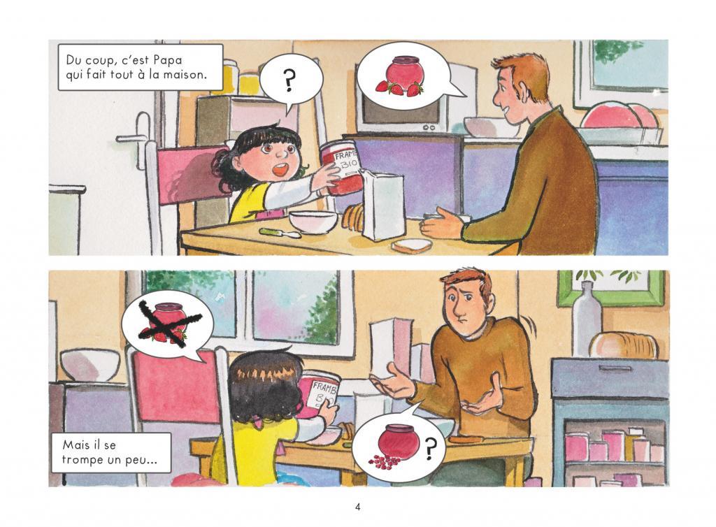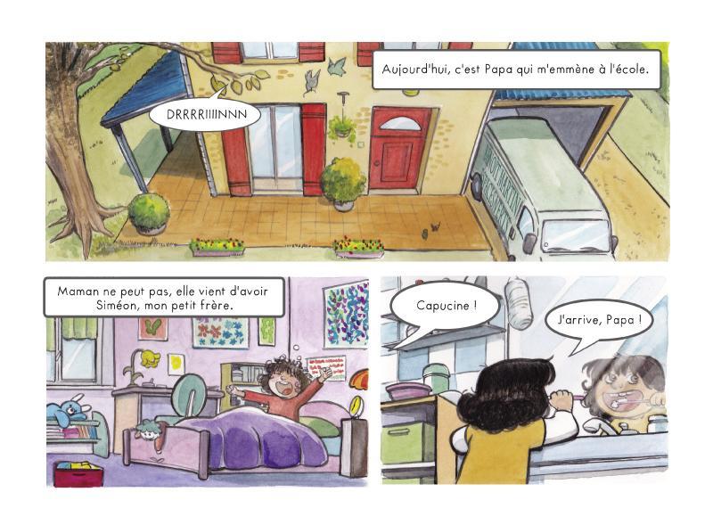 Capucine, 6 ans, vit avec ses deux parents dans un petit pavillon. Sa maman est absente parce qu’elle est à la maternité et vient de donner naissance à un petit Siméon. C’est donc naturellement Benoît, son papa qui s’occupe d’elle. Après le lavage de dents, l’homme paysagiste de profession, l’attend dans la cuisine pour le petit-déjeuner. Mais voilà, il confond la confiture de fraises et celle de framboises. De plus, sur le chemin de l’école, il se trompe de route. Capucine pense qu’il fait des erreurs parce qu’il n’a pas l’habitude. Pourtant le mal est plus profond : il est illettré. C’est pour cela qu’il est si nerveux à l’approche de l’école. Il a eu un rapport conflictuel avec elle, causé par sa hantise de la lecture. Il n’ose même pas y entrer.