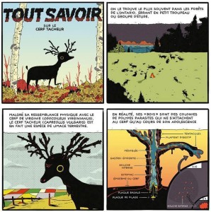 Résumé de l’éditeur : Du célébré Cerf tacheur au parodique Les Muscles de Peter, on retrouve ici certaines des obsessions de l’auteur, comme, en vrac, les cerfs, Snoopy, la maladie, le corps et ses fonctions – et si DeForge aime distordre la réalité, mélangeant un ton naturaliste et des événements fantastiques, c’est pour mieux révéler tout l’absurde et le grotesque qui gît-là, au plus profond de l’esprit humain. Les histoires se suivent ici sans se ressembler, passant du noir et blanc à la couleur, de l’expérimentation formelle à l’ humour pur, avec en commun une vision du monde souvent désenchantée, voire désespérée, mais savamment contrebalancée par une inventivité formelle enthousiasmante.