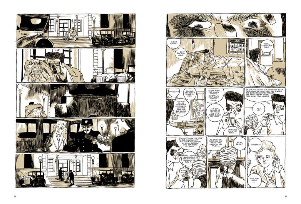 Le récit très dense de Lorenzo Palloni est un pur polar, avec des mafieux italo-américains, la prohibition, des anarchistes comme Sacco et Venzetti, des flics, des agents du FBI et des cadavres. Une histoire avec un rythme haletant, de nombreux rebondissements et des intrigues à tiroirs ; tout cela écrit avec une grande maestria par le scénariste italien. Tout au long des 152 pages, le lecteur va être surpris, y compris avec le secret de Marco. Les personnages, avec une belle épaisseur, sont formidables à souhait, entre répulsion et attachement. Même les bons, comme le lieutenant ou Elisabeth, l’agent du FBI, ont des failles et peuvent être détestables, voire véreux pour les policiers ou les politiciens. De plus, les dialogues sont ciselés, comme dans les films noirs des années 50/60. En effet, ce récit fort et parfois poignant ferait une belle base de travail pour élaborer un long métrage. Quant au dessin, si parfois il semble un peu jeté, son effet vif colle parfaitement avec l’ambiance rapide et très noire de l’histoire. Les trognes des mafieux ou celle de Howard sont formidablement bien dessinées. Le trait en bichromie sépia et noir de Andrea Settimo permet de livrer des planches où le cadrage et le découpage sont magnifiques. Un excellent roman graphique-polar pour cette rentrée.