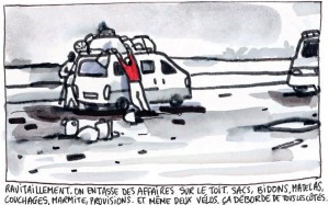Bessora et Barroux, les deux auteurs, se sont rencontrés lors de La 25e heure, le salon du livre du Mans. Ils décident alors de raconter le road-trip saisissant et touchant d’Alpha, parcourant 6000km, quasiment à pied. L’ébéniste vivant dans la capitale de la Côte d’Ivoire ne rêve que d’une chose : venir rendre visite à sa belle-sœur à Paris. N’ayant plus de nouvelles de sa femme et son fils qui ont quitté le pays vers le Nord, il décide lui-même de les rejoindre. Mais son périple ne se déroulera pas sans difficulté. Avant le départ, il lui faudra : trouver de l’argent pour le visa, se prostituer, vendre de la drogue ou encore échapper à la police. Puis son voyage de 18 mois, il le passera dans des voitures et des camp de fortune, entre changements de direction et arrêts forcés. Sur sa route, il rencontrera aussi d’autres personnages bouleversants, attachants et déboussolés, comme Abebi, Augustin ou Antoine. Cette conviction qui en fait sa force est magnifiquement mise en image par Barroux. Les textes de la scénariste se placent sous les cases. Les planches sont portées par un trait aux feutres et aux lavis pas très attirants au début mais qui charment au bout de quelques pages.