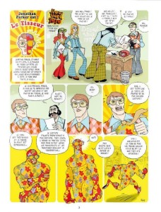 L’album de Pochep est un savoureux recueil de mini-récits burlesques et totalement décalés. Quatre personnages évoluent dans un monde seventies complètement fantasmé et essaient de préserver au mieux la mode des années 70, de haute lutte. Les personnages sont savoureux, comme : Jonathan Parker, alias Le tisseur, photographe du magazine Star New Fashion, se transforme en super-héros, tel Superman. Il traque le mauvais goût dans un costume hyper fleuri. Il y a aussi Doug, modèle depuis 30 ans pour Eternal Sunshine, est dépassé par la mode qui évolue. Warren, démocrate désabusé, vit une seconde jeunesse, entre son fils qui se prostitue et sa femme alcoolique. Et enfin, La brigade capillaire est composée de deux détectives, Cassaro et Konaski, gardiens des mèches longues, des brushings façon Dallas et des rouflaquettes. En somme, que des personnages à la limite et qui sont obsédés par la mode. Qui mangent mode, qui travaillent dans la mode et qui dorment mode. Dans ces petites histoires, il y a du 70’s show, du Starky & Hutch ou du Superman et c’est très amusant. Cette décennie, haute-en-couleurs, se prête merveilleusement bien à ce style de récit. Une période disco, de folie et très junkie. Le trait de Pochep est dans la droite lignée des albums de cette période, entre Gilbert Shelton et les albums 70’s de Fluide Glacial.