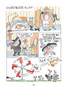 Décliné en chapitre, selon les jours de la semaine, Journal d’un chat assassin met en scène un chat complètement barré et détestable au plus haut point. Tuffy, le vilain matou aime chasser et manger des oiseaux ou des souris, comme tous les chats. Seulement sa famille, elle, ne l’entend pas ainsi et notamment Ellie, la petite fille. Il ira même jusqu’à faire trépasser Thumper, le lapin des voisins. Le père et la mère trouvant un stratagème amusant pour ne pas accuser le vilain chat. On n’est pas très enthousiaste à la lecture de l’album de Véronique Deiss, il faut dire que les romans sont formidables mais l’adaptation plutôt faiblarde. La déclinaison n’est pas une chose aisée. Non par le trait humoristique de l’auteure mais par les histoires choisies, pas d’une grande originalité et assez simples.