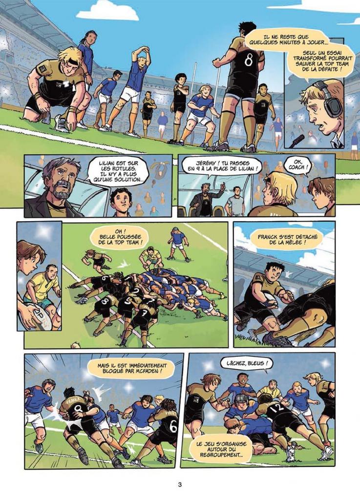 Résumé de l’éditeur : La Top Team est une équipe de rugby constituée des 14 meilleurs espoirs de chaque club de l’élite française. Plus Jeremy, un jeune garçon fan de rugby qui gagne un concours de pénalités lui permettant d’intégrer le groupe. Cette équipe va porter haut les couleurs de tous les clubs du TOP 14 en affrontant ses homologues européens et tenter de remporter le bouclier « Team Challenge ».