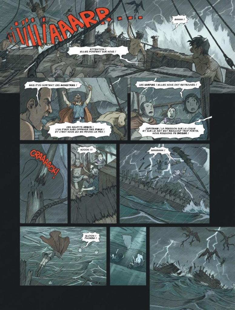 Résumé de l’éditeur : Alcyon et Phoebe sont partis à l’aventure pour retrouver un collier légendaire, pensant ainsi pouvoir réparer une injustice faite à leur tribu et à leurs pères respectifs. Aidés par Kirilos, un jeune Sparte, les jeunes amis se sont embarqués sur la mer Egée, mais ils sont poursuivis par un tueur qui a pour mission de les empêcher d’accomplir leur quête fabuleuse. Ils découvrent bientôt la réalité de créatures qu’ils croyaient légendaires, comme les fameuses harpies.