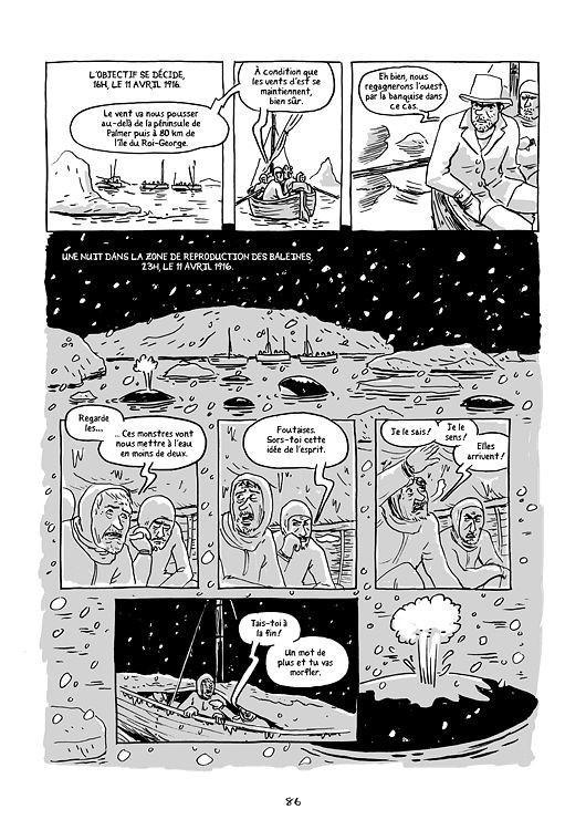 L’auteur de Jérusalem portrait de famille (Casterman, 2009) ne nous épargne rien : ni les éléments déchaînés (vent, tempête), ni les glaces qui emprisonnent leur navire, ni les icebergs, ni les galères, ni la mort de tous les chiens, ni les orteils coupés. Pourtant, cette équipage ne se découragera jamais et cet optimisme se ressent à chaque page : ils joueront au foot sur les glaces, aux cartes, liront et même continueront de chanter accompagnés d’un banjo. L’équipage de l’expédition transantarctique impérale est hétéroclite : 28 hommes dont des navigateurs, des officiers, des mécaniciens, des chauffeurs, un maître-chien, des matelots mais aussi un artiste, un photographe et des hommes de science. Malgré tous les aléas, ils survivront miraculeusement. Le trait en noir et blanc teinté de gris de l’auteur américain insuffle ce petit goût d’aventure, parfait pour son ouvrage très documenté.