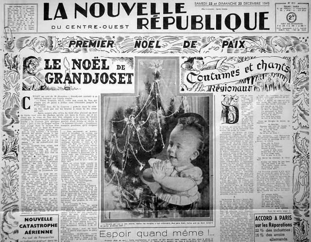 La Une de Noël 1945. Le premier Noël de paix titre la Nouvelle République. La fresque tout autour de la page est signée Émile Jaquemin.