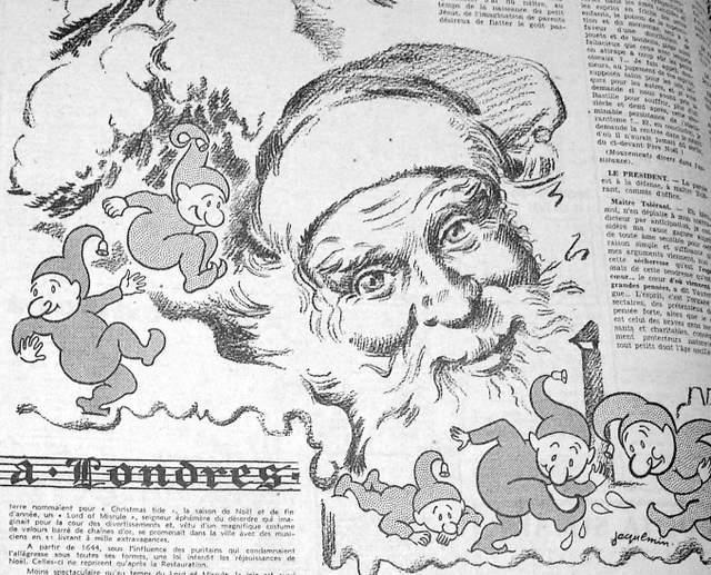Bien que plongé dans ses vieux papiers, l’oncle Erwann, tout de même sensible à la magie du moment (ah, relire Noël et l’Élaoin, ce conte émouvant de Franquin justement restitué sous la forme d’un mini-récit à fabriquer soi-même dans le remarquable hors série n°19 du magazine Lire : » Franquin le géant du rire » ! ), l’oncle Erwann donc, a tiré de leur sommeil quelques illustrations vieilles de 70 ans.