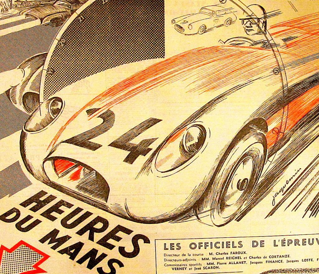 Pourtant, oncle Erwann devra revenir (si, si, on y croit) sur le traitement assez étonnant des étapes du tour de France toujours en bandes verticales par Jaquemin et Hervéou (jusqu’ en 1959) et sur la présence de dessinateurs sportifs « indépendants » du studio NR. Juste pour signaler aux gourmands qu’il s’agit de Siro, de Luc Vincent, du maître Pellos (mais oui, dans les colonnes de la Nouvelle République des années 50) mais aussi, avant qu’il ne préfère la politique et l’art lyrique, Maurice Tournade, qui à ses début signait èM.Té.