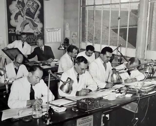 Le studio en 1957 : au fond, Jaquemin en discussion avec Pierre Petit en blouse blanche comme tous les dessinateurs. Devant eux (de g. à dr.) : Étève, Bry, Hervéou ; au 1er rang (de g. à dr.) : Riche, Chamblet, Charpentier, Lanneau. (Photo La Nouvelle République)