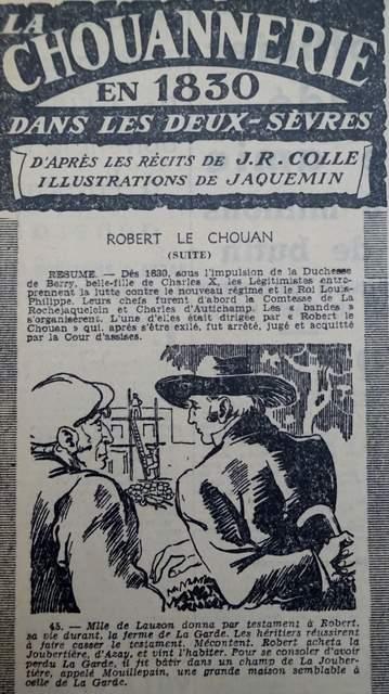 > Suivra, en 1951, avec des illustrations de Jaquemin, « La chouannerie en 1830 dans les Deux-Sèvres » d’après une thèse de 1948 de Jean-Robert Colle, historien régionaliste du Poitou, originaire de Lezay (Deux-Sèvres).