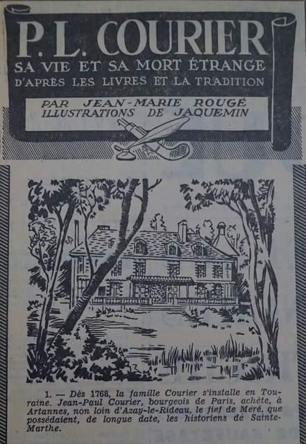 > En 1954, ce sera le tour de « Paul-Louis Courier : sa vie, sa mort étrange d’après les livres et les traditions ». C’est encore Jaquemin qui signe cet opus sur un texte de Jacques-Marie Rougé (rien à voir avec le braconnier !), écrivain régionaliste et « folkloriste » (au sens fort du terme), créateur d’un musée du terroir à Loches (dans le sud de la Touraine) et animateur de la société archéologique de Touraine.