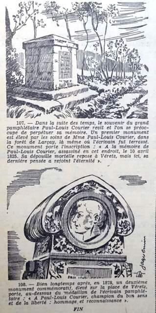 L’impertinent Paul-Louis Courier (qui serait peut-être enchanté de savoir que des générations de lycéens qui se sont succédés dans l’établissement qui porte son nom à Tours l’ont toujours désigné sous le diminutif de « Popaul » !) est un polémiste tourangeau talentueux, pamphlétaire de haute volée, libéral et anticlérical et pas du tout bonapartiste qui finira assassiné par son garde-chasse en forêt de Larçay, près de la commune de Véretz en Indre-et-Loire, en 1825. Un monument simplissime (un bloc de pierre) qui rappelle les faits est toujours visible dans les allées de ces bois très fréquentés.