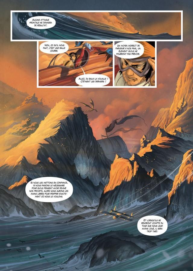 Un souffle épique déferle chez Delcourt depuis le premier volume du Soufflevent. Il faut dire qu’Andoryss sait maintenir le suspens dans son récit. Professeur de SVT, l’auteur a inventé de nombreux univers dans ses romans comme Les enfants d’Evernight qu’elle a adapté en bande dessinée en 2011 avec Eric Yang. Prévue en quatre tomes (le tome 3 sortira en août 2015, le rythme étant soutenu), l’histoire de ce deuxième volet fait la part belle au fantastique, à la magie, aux engins volants et aux combats aériens. La tension narrative est à son comble puisque Typhon, le chat parlant de Coline, a été enlevé, que Firenza et ses hommes convoitent toujours le Soufflevent et que les relations entre la jeune fille et Sacha sont délicats, entre attirance et répulsion. D’ailleurs le pilote de l’Aéropostale apporte la touche d’humour dans ce récit à tension. De nombreuses scènes très réussies se déroulent chez les pirates et cela permet de relancer le récit.