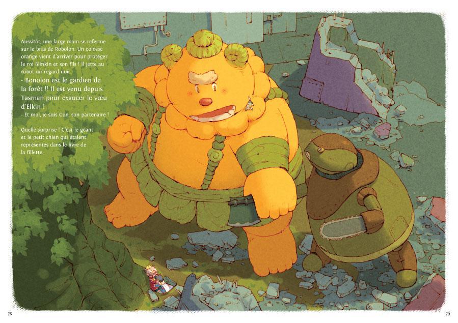 Résumé de l’éditeur : Gentil géant aux allures de gros ours orange, Bonolon est un esprit de la nature qui vient au secours de tous les êtres vivants. Dès lors que les larmes d’une âme en détresse touchent les racines d’un arbre sacré, Bonolon, accompagné de son meilleur ami Gon, le petit chien, apparaît pour lui proposer d’exaucer son vœu le plus cher. Bien sûr, ses pouvoirs ne sont pas sans limite mais, chaque fois, Bonolon fait de son mieux pour répandre le bonheur autour de lui.