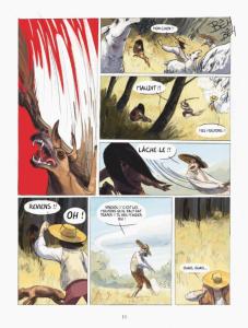 La couverture mystérieuse invite le lecteur à ouvrir l’album. Pour mettre en image Sauvage, Jean-David Morvan et Aurélie Bévière ont choisi Gaëlle Hersent, ancienne élève des Beaux-Arts d’Angoulême. Son trait vif et semi-réaliste ainsi que son découpage imposent un rythme fou à l’album. Les expressions des visages sont d’une très grande force. Pour restituer au mieux l’ambiance de la Cour, elle s’est inspirée des peintres du 18e siècle comme Frogonard, Chardin, Watteau ou Liotard et s’est beaucoup documentée sur la culture amérindienne pour l’enfance de Marie-Angélique. Il faut ajouter que les magnifiques planches muettes apportent des respirations bienvenues dans cet album parfois cruel.