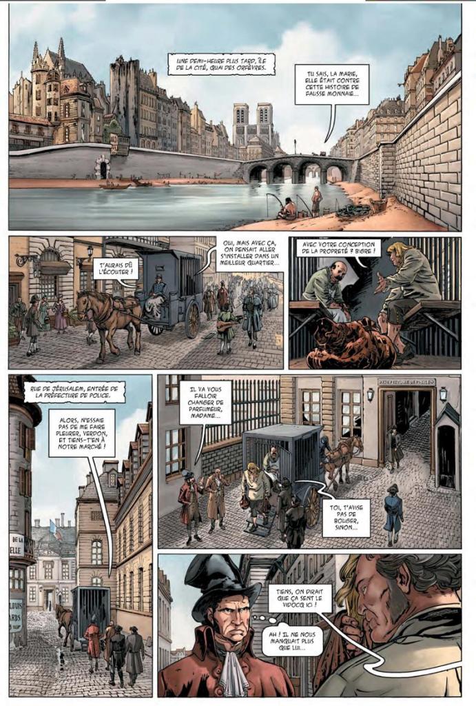 De Vidocq on croyait tout connaître, notamment par l’adaptation télévisée Les Nouvelles Aventures de Vidocq (ORTF 1971 – 1973) avec Claude Brasseur et Danièle Lebrun pour les plus anciens d’entre nous, mais aussi Vidocq, le film de Pitof avec Guillaume Canet et Gérard Depardieu (2001) ou enfin par les adaptations dessinées Les Aventures véridiques du policier bagnard Vidocq signées René Giffey et R. Laude en 1939 (Société parisienne d’édition) ou encore Alchimie du même Richard D Nolane et Olivier Roman (Soleil, 2010). Le scénariste s’y essaie encore, pensant que le matériel (la vie épique et romanesque) de son personnage peut encore délivrer quelques vérités ou anecdotes.