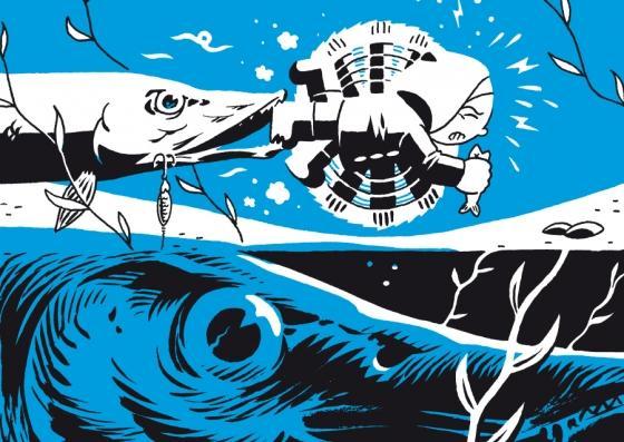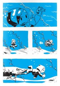 Petteri Tikkanen met en place une histoire d’une belle simplicité et teintée d’un petit humour agréable (les moments avec l’oiseau ou celui avec le brochet sont délicieux). Le passage à l’âge adulte (marqué ici par la jalousie) est magnifiquement mis en lumière par une partie graphique, point fort de l’album : les planches en bichromie de l’auteur finlandais (Kanerva et un truc, 2007) sont formidables. Le dessin est composé d’un trait d’une grande lisibilité influencé par les auteurs américains des studios Fleischer (Popeye ou Betty Boop). Il est couplé par de grands aplats bleus et noirs très bien maîtrisés.