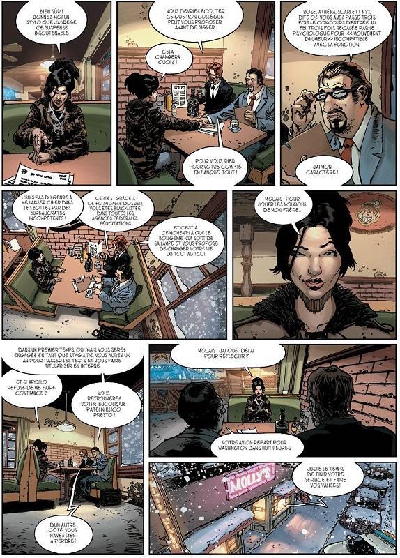 Il faut prendre le temps d’ouvrir cet excellent album et ne pas rester seulement sur la vision de la couverture, pas très accrocheuse et un peu ratée. Il faut dire que la thématique de cette nouvelle série est très originale (même si on parle beaucoup en ce moment de la NSA, de Wikileaks ou d’Edward Snowden) : Thierry Gloris mêle habilement l’espionnage, les relations fraternelles et la maladie. S’appuyant sur un duo de personnages antinomique, il mène son lecteur dans une enquête haletante qui va à cent à l’heure. Il y a d’abord Appolo, afro-américain d’une trentaine d’années atteint du syndrome d’Asperger et véritable génie. Tous les matins à heure fixe, Aaron, Abigail et David, des agents de la NSA, lui montrent des images venues du monde entier. A travers ce programme secret de l’agence américaine, il réussit à deviner les événements importants qui vont arriver ; comme par exemple les attentats du 11 septembre, seul à l’avoir prédit. Alors que sa mère est renversée intentionnellement par un chauffard, il se retrouve seul. Pourtant, à l’autre bout du pays, il existe Oz, sa demi-sœur, qu’il n’a pas vu depuis longtemps. Jeune flic aux méthodes musclées, elle n’a jamais réussi à entrer au FBI. En acceptant de protéger son frère, elle ne savait pas qu’elle serait au cœur d’une drôle de machination.