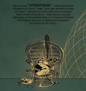 Sous-titré La société française par l’exemple, Anthroporama dresse un portrait humoristique de la France du 21e siècle. Diego Aranega se glisse dans les habits d’un anthropologue auto-proclamé, le temps de ce recueil de 10 mini-récits. Sous ses aspects de scientifique, il dépeint des situations cocasses qui font mouche. Tout y passe : une société qui organise des stages d’auto-défense, une émission télévisée culinaire (avec une vraie recette!), une people school dirigée par Karl Lagerfeld ou comment devenir une star de la téléréalité, une entreprise low-cost pour les riches, un stage pour les lutter contre les nouvelles addictions ou une agence de pub.