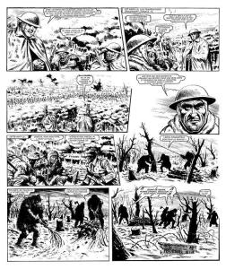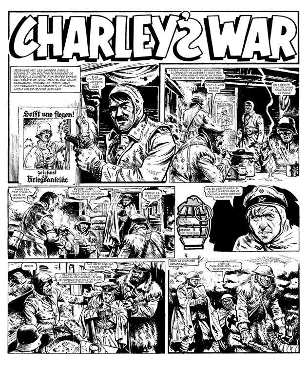 Le récit de Pat Mills est de nouveau fort, dense et accrocheur. Hyper réaliste dans le quotidien des soldats (grâce à une documentation solide basée sur les écrits d’historiens britanniques), ces moments délicats sont contés de manière magistrale. S’il a choisi des personnages lambda (Charlie et les Tommies) pour le faire au mieux, il introduit un homme célèbre en la personne d’Adolf Hitler, qui a bien participé à la Première Guerre Mondiale mais il lui imagine aussi son existence dans les tranchées. Ce moment fictionnel est formidable, faisant de lui un être ignoble, hautain, violent et rancunier (tout ce qu’il sera par la suite lors de son ascension au pouvoir et la mise en place du 3e Reich). La version est moins réjouissante pour le futur dictateur. Comme le mentionne Ian Kershaw ou d’autres historiens dans leurs recherches : il n’était qu’une simple estafette (chargée de faire passer les messages entre les différentes unités), planqué, peu sûr de lui, insignifiant, blessé il ne terminera pas la guerre et quittera le front en 1917.
