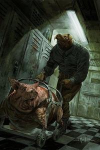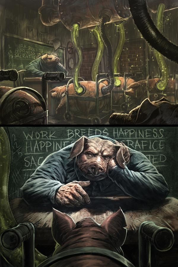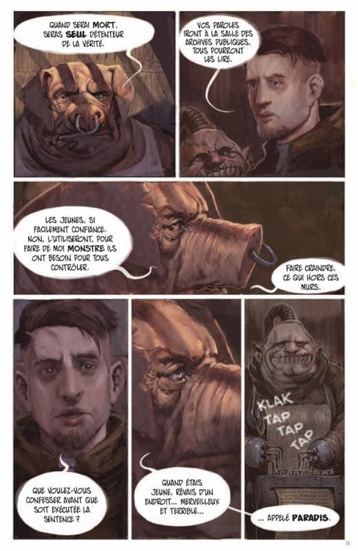 La partie graphique est de haute volée ! Les personnages sont d’une grande expressivité et les décors sombres sont très détaillés. Chose étonnante, les cochons-esclaves sont habillés en métalleux et portent des rangers. De plus, 12 pages de croquis et un galerie de couvertures dessinées par d’autres auteurs sont adossés à l’album.