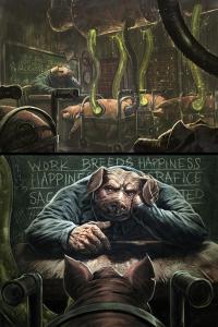 Oink le boucher du paradis est un excellent album de science-fiction d’une très grande noirceur, original dans son histoire et dans son dessin. Publiée par Dark Horse Comics aux Etats-Unis, l’histoire de John Mueller est avant tout une envie très personnelle de son auteur, une somme de peurs de son enfance. Il y met sa vision très pessimiste de l’école et de la transmission du savoir. Par Oink, il veut démontrer qu’il fut un survivant d’un système scolaire qui met de côté les artistes et qui inculque de fausses valeurs. Il faut souligner qu’il a passé onze ans dans un institut scolaire très spécial. Comme pour lui, son personnage, cochon-esclave génétiquement modifié, son éducation est imparfaite (il ne forme pas de vraies phrases). Oink subit des humiliations, ne peut pas réfléchir par lui-même, répète des gestes identiques tous les jours et est aliéné par son travail.