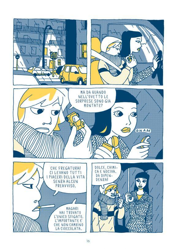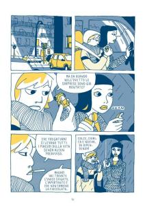 A aucun moment, l’auteure italienne ne donne de leçon ni ne prend partie, laissant le lecteur se faire sa propre opinion. Parfois celui-ci est ballotté entre son attirance pour Sabrina et son envie de l’aider mais aussi une forme de répulsion se disant qu’elle mérite sa condition. Album d’une belle émotion et touchant, Luci Biagi propose un trait d’une grande modernité et d’une belle simplicité. Ses planches en trichromie (bleu, blanc et jaune) sont efficaces et très lisibles.
