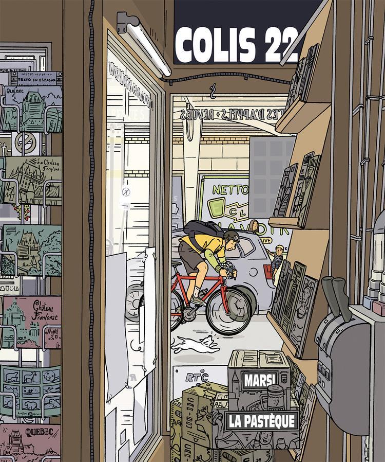 Pluton est coursier dans la vie. Chevauchant son vélo, il trace sa route à vitesse rapide. Même si son travail est peu rémunéré, il le fait avec un grand professionnalisme. Alors qu’un jour Mercure, sa compagne, est fatiguée, il accepte de la remplacer dans l’acheminement d’un étrange colis qui va engendrer de drôles de conséquences sur sa vie. Colis 22 met en scène ce beau roman graphique signé Marsi et publié par La Pastèque.
