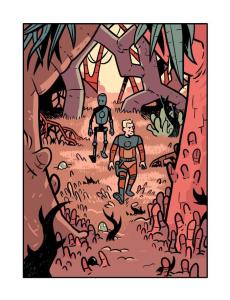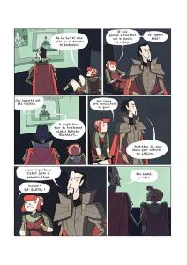 De plus, les personnages participent de ce beau comics décalé. D’ailleurs, ces derniers ne sont pas si manichéens que cela. Banni et désigné comme ennemi public n°1, Blackheart n’est ni sanglant ni provocateur mais cherche juste à faire éclater la vérité : celle du tournoi final où il perdit son bras, arraché par un coup de fusil volontaire de Goldenloin. Il ne souhaite pas s’en prendre aux habitants comme voudrait le faire croire L’institut pour le maintien de l’ordre héroïque qui règne sur les médias et le royaume. Son meilleur ennemi n’est pas le chevalier blanc que l’on présente, se murant dans le silence et le mensonge. Quant à Nimona, elle se révèle plus violente, sanglante et sans scrupules que son maître.