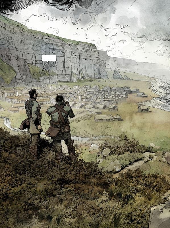 La partie graphique de la série Society sera assurée par quatre dessinateurs : Torrents, Nespolino, le talentueux Ronan Toulhoat (qui signe ici la couverture du premier tome) et donc Stéphane Bervas. Son trait réaliste est d’une belle dynamique, fluide et d’une grande justesse. Il faut souligner que les formidables couleurs de Jean Bastide mettent agréablement en lumière les planches de l’auteur de 2021 (avec Betbeder, Soleil). Le dessinateur a apporté beaucoup de soin pour les décors des villes de Londres et Kerlodge (voir la très belle illustration pleine page mettant en scène Holmes et Watson sur les hauteurs de la petite cité, page 22 – illustration ci-dessus).
