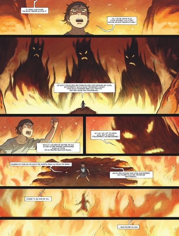 Que dire de plus que nous ayons pu dire sur cette excellente série ? Rien, si ce n’est que c’est toujours aussi bon. Le duo Marazano-Ferreira continue de nous enchanter grâce à cette trilogie menée tambour battant. L’histoire de ressorts classiques ne l’est pourtant pas tant que cela. Il faut souligner que le scénariste fait vivre à son trio de personnages des aventures folles et originales où ils croisent des créatures fabuleuses de la mythologie grecque mais aussi de véritables méchants. Partis à la recherche du Collier d’Harmonie afin d’apaiser les tensions dans leur village et sauver leur deux pères, Alcyon et Phoebe ont été rejoint par Kyrilos depuis la fin du premier volume. Le lecteur découvre Alcyon sous un nouveau jour : têtu, boudeur mais tellement valeureux. Ses prises de bec avec Kyrilos, le spartiate sont fortes et souvent amusantes.