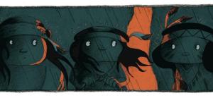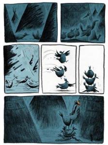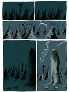 Comme à son habitude, le scénariste propose une histoire muette intelligente et formidable pour les plus petits. Comme pour chacune d’entre elle, le petit indien doit passer une étape importante de son existence par une rencontre. Ce passage vers l’âge adulte est merveilleusement mis en scène. Après la chasse d’un lapin dans Le coup du lapin ou la capture d’un cheval dans Duel dans le plaine, Anuki doit surmonter sa peur à l’approche d’un Sasquatch. Afin d’apporter un peu de légèreté et d’humour dans ce récit un peu angoissant pour le jeune lectorat, Maupomé glisse trois poules et un coq amusants et un peu fous. Ces quatre gallinacés suivent pas à pas les trois amis dans la forêt.