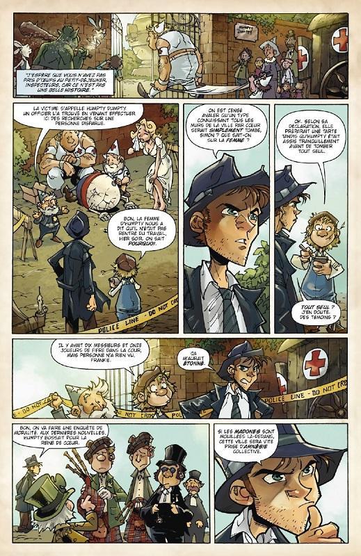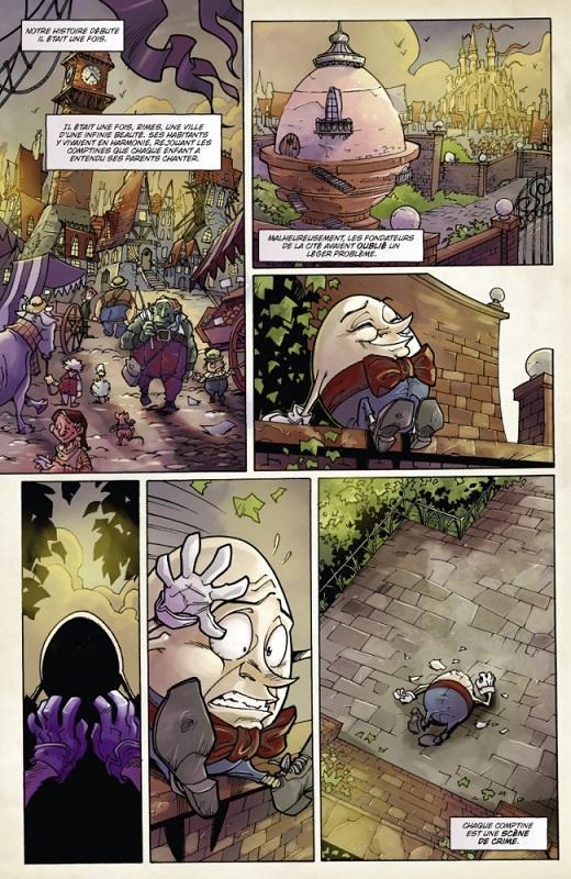 Bois-des-Contes est un lieu assez cosmopolite, mais aucun endroit n’est plus dangereux que la cité de Rimes, située au fin fond du royaume de l’enfance. Ici, Franckie Mack, détective raté issu d’un roman policier jamais terminé, est sur le point de dévoiler une conspiration susceptible de détruire le monde des contes de fées ! Tout commence lorsque Franck et son assistant, Simple Simon, sont mis sur une affaire : le meurtre d’un certain Humpty Dumpty, jeté du haut d’une tour. Dans leur enquête, ils croiseront la route d’Alice, Dorothy du magicien d’Oz, mais aussi de certains personnages de Fairy Quest.