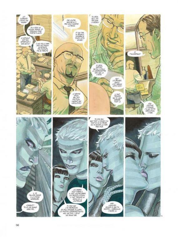 Le récit de Thilde Barboni est construit comme un thriller où les femmes très dénudées sont au cœur de l’album. Disons-le tout net, le scénario de l’auteure ne nous convainc guère. Il faut dire que la profusion de personnages perd le lecteur assez rapidement. Le ton lancinant du récit n’accroche pas non plus le lecteur. Psychologue de formation, la scénariste belge met en scène une héroïne très (trop ?) complexe : Monika, et par son entremise l’ombre de sa sœur Erika, aime se déguiser, se grimer avec des perruques des plus fantasques. La jeune femme séduisante et belle est très troublée par la disparition de sa sœur, qui n’avait pas de bonnes relations avec elle et qui est toujours marquée par la mort de sa mère.