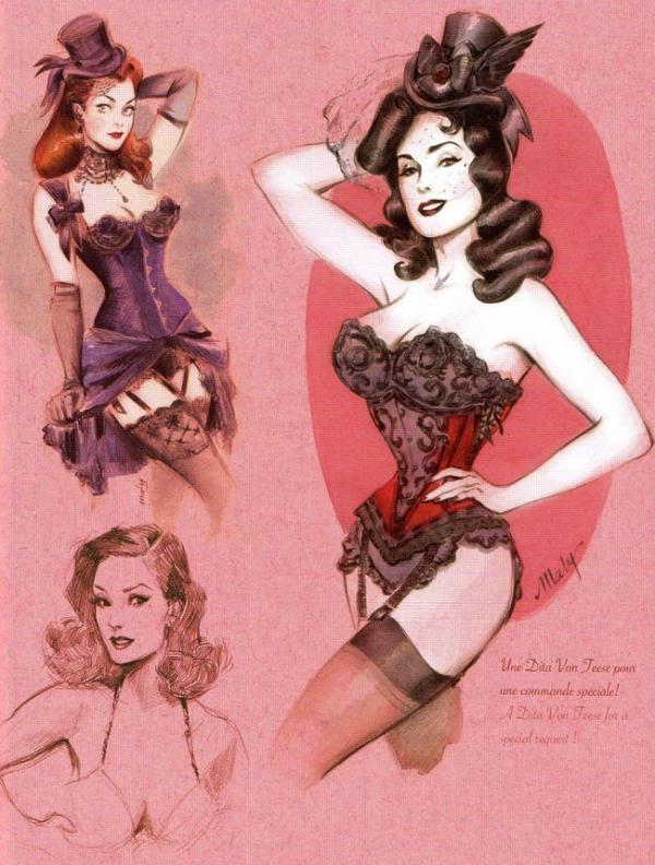 Maly Siri s’est inspirée de documents de l’époque (entre 1930 et 1950), de couvertures de magazines, d’affiches ou de publicités pour rendre un hommage à ces femmes très sexy. Cet ouvrage de 128 pages se veut un pastiche dédié à ce genre pictural de la pin up. Pour accompagner les illustrations, des textes sont signés JC Deveney, Vincent Raymond et Voldy Voldemar, ainsi qu’une préface de Chantal Thomass.