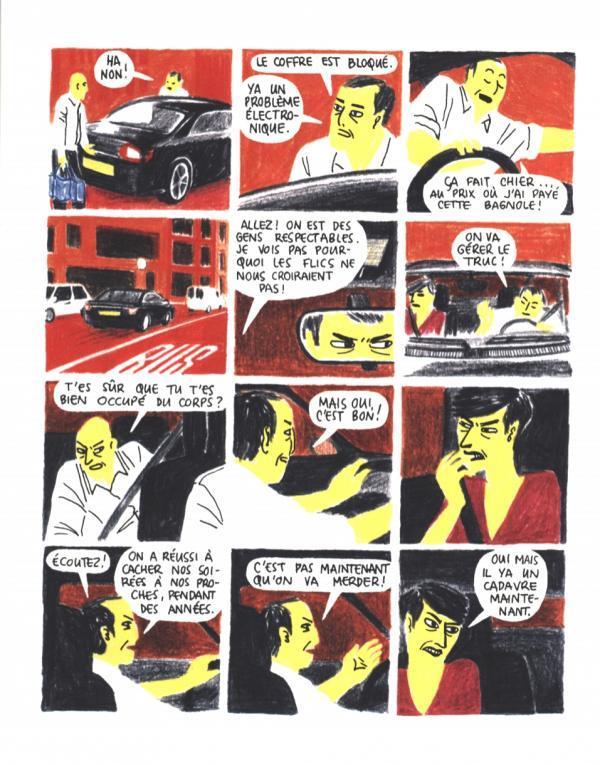 Voilà un album original et singulier, extrêmement réussi ! Le récit très maîtrisé de Philippe Vanderheyden est construit comme un polar très sombre, mettant en scène quatre personnages (3 hommes et une femme) à la fois cyniques, parfois hautains et aux mœurs à la marge. Dans leur société, il est facile de dominer les autres psychologiquement mais aussi physiquement. En effet, pour passer le temps et ne pas penser à leur vie maritale si sérieuse ennuyeuse, ils aiment jouer ensemble avec leur corps à des jeux sexuels SM. Mais un soir, le ton monte et l’un d’entre eux tue un de ses camarades. Cacher le corps, mentir et refus d’être solidaire, tout est là pour accrocher le lecteur. Le dessin à la craie agrémenté par quelques traits de Lucie Castel joue sur les couleurs lumineuses qui tranchent avec le propos du récit.
