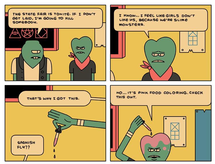 Si vous vous promenez tranquillement dans la rue et que vous tombez nez à nez avec les Blobby Boys, un conseil : faites demi-tour et partez en courant ! Ces 3 faces de Slime (pâte verte gluante et dégoulinante à la mode dans les années 90) ne sont pas des enfants de chœur. Ils disent être des aliens venus d’une météorite écrasée non loin. En attendant, ils sont coincés parmi les humains à essayer de survivre en dealant de la marijuana.