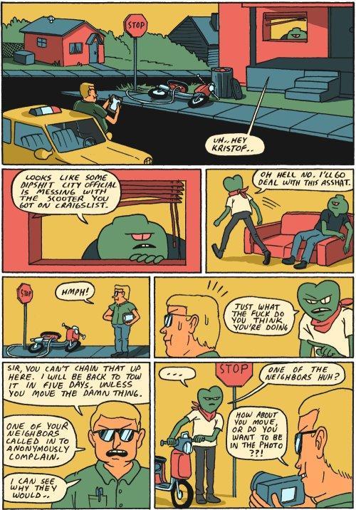 Arrivé d’Iran en 2011, via la Malaisie, après 3 mois d’emprisonnement dans son pays, il tente désespérément de recevoir le fameux sésame. Incompréhensions à cause de la barrière de la langue, obtention de nombreux récépissés (un moment digne des 12 travaux d’Astérix) ou fonctionnaires peu compréhensifs, rien n’est épargné à ces personnes déboussolées, laissées seules et désarmées. Neyestani dit d’ailleurs de ces moments délicats : « La bureaucratie française est une véritable culture, une vieille tradition et un horrible cauchemar. Avant de commencer vos démarches, sachez qu’il faut respecter la loi. Que dit la loi ? La loi est une personne assise derrière un bureau et qui tient votre avenir entre ses mains ».