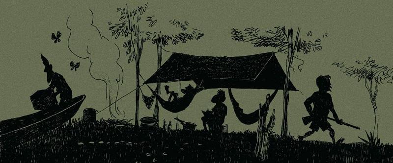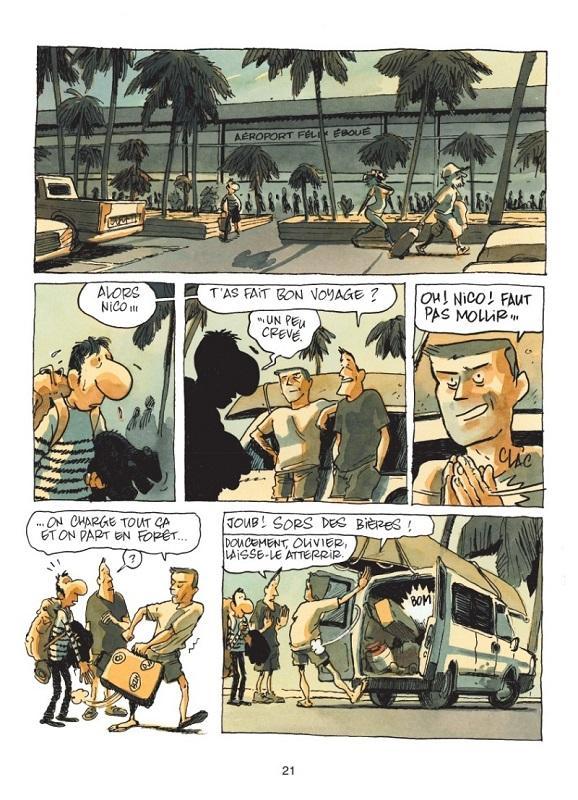Sac à dos et lampe frontale, les quatre potes embarquent sur une pirogue, destination le carbet de Jérôme (habitation sommaire ne comportant qu’un toit sans murs). Assis autour d’une table, c’est le début des histoires racontées par les deux beaux-frères : animaux chassés, moustiques et orpaillage clandestin. La faune et la flore sont d’ailleurs détaillées sur trois pages : caïman, cochon-bois, iguane ou anaconda. Leur amour de la Guyane, ils la doivent à Domingo, un amérindien clandestin, ancien orpailleur, qui leur a tout appris.