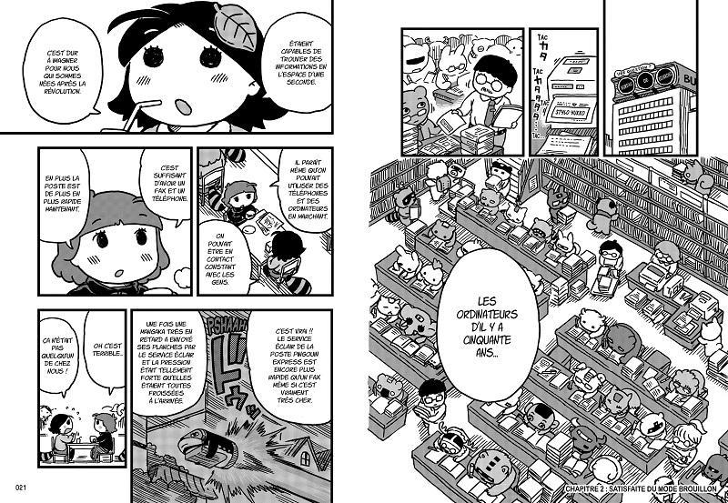 Drôles et très rafraîchissantes, les mini-histoires de Yako et Poko permettent au lecteur de passer plutôt un agréablement moment. Simple dans sa construction et dans son récit, le manga propose une atmosphère douce et chaleureuse, comme si les deux personnages étaient des doudous que l’on veut serrer dans ses bras et qui nous cajoleraient. Tendre et mélancolique, ce premier volume met en scène Yako, une mangaka qui a du succès avec sa série et Poko, son chat-robot qui l’assiste sur ses planches. Comme tout bon mangaka, elle possède donc un robot androïde qui lui permet de gommer ses croquis et recherches et s’occupe des décors. Alors qu’il est positionné sur le mode moyen pour son aide en dessin, ses amies sont étonnées de ce fait. De plus, son éditeur lui propose d’accélérer le rythme mais aussi de publier plus de chose dans son magazine ; ce qu’elle refuse poliment.