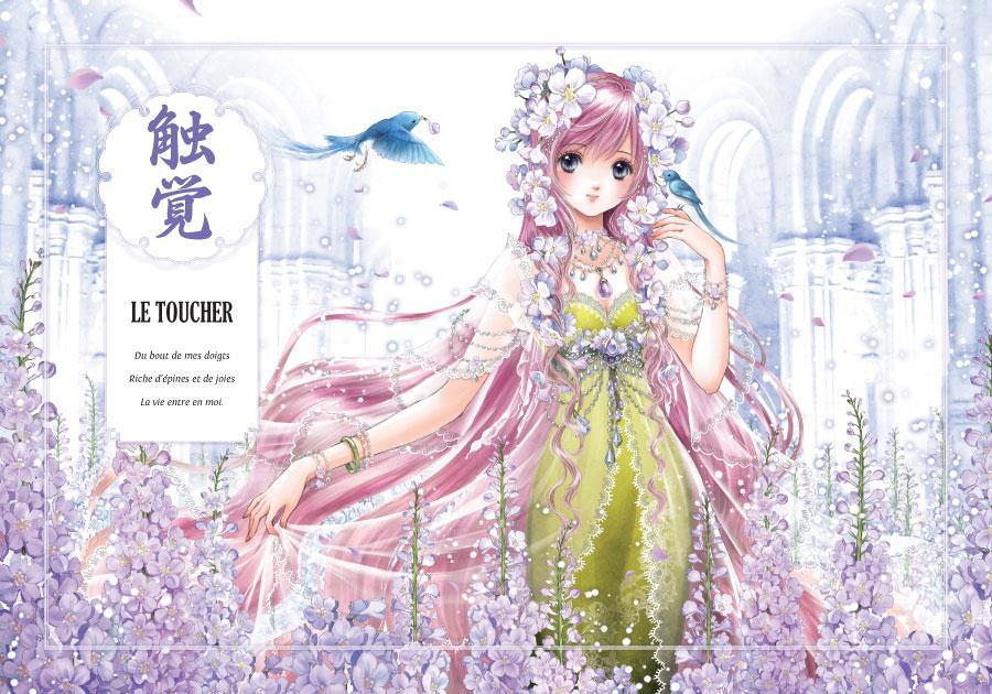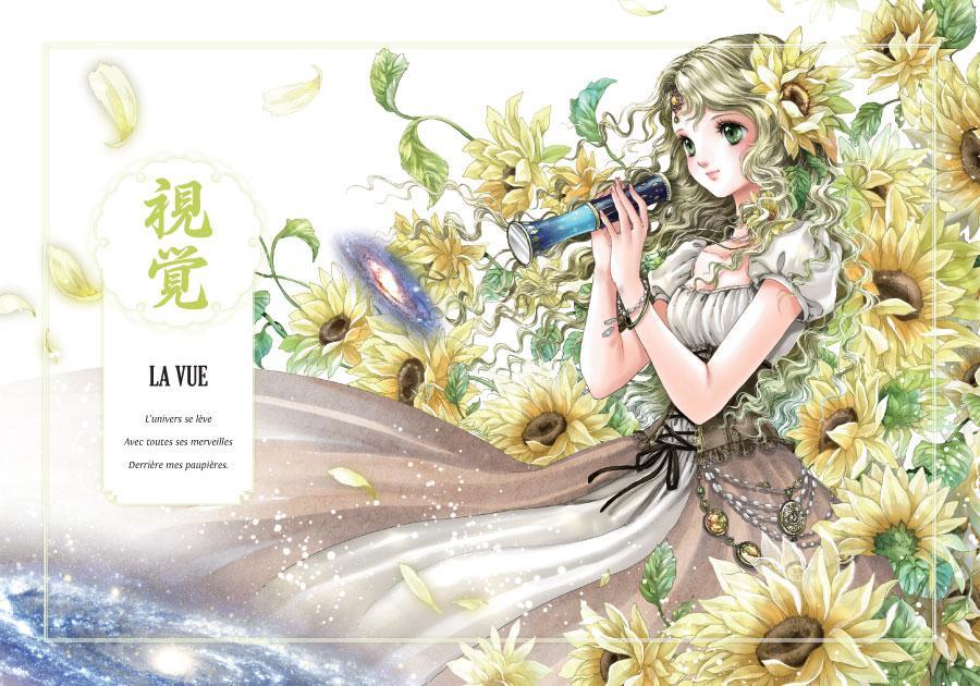 Ouvrez vos âmes ! Laissez entrer la caresse d’un rayon de soleil ou le goût indécis d’une goutte de pluie… Laissez s’y glisser le parfum frais d’un courant d’air ou les lumières de la mer… Recevez-les, écoutez-les, et ne craignez pas les tempêtes : fées, nymphes, sirènes et sylphides vous protègent, c’est une promesse. Dans votre corps comme dans une forteresse, ce sont la Vue, l’Ouïe, l’Odorat, le Goût et le Toucher qui vous serviront le tourbillon du monde. À vous alors d’en saisir l’essence, un sens peut-être, ou même simplement le délicieux sentiment d’être ici et maintenant, à jamais et pour toujours relié au présent.