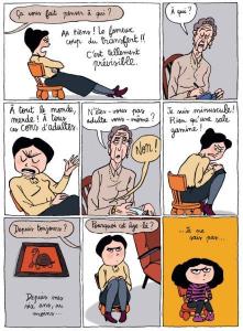emilie (4)Le côté didactique est apporté par les pages intercalées çà et là, introduites par son collègue et qui explique les termes de la psychanalyse : la dépression, les différentes formes de psychothérapies ou le transfert. Le tout est porté par une partie graphique simple et très moderne. Le trait d’Anne Rouquette est très coloré, d’une belle lisibilité, qui apporte lui aussi sont lot d’humour. Un petit album frais et rigolo pour déconstruire les mythes de la psychanalyse et la dédramatiser. Une belle réussite !