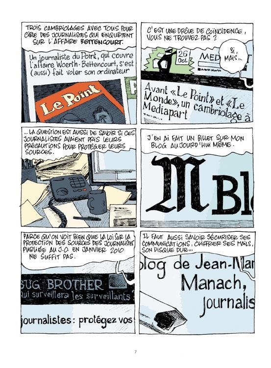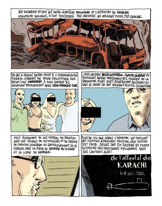 grandes oreilles (4)Toutes ses magouilles, ces montagnes d’argent sont alors découvertes une à une grâce à cette enquête mais aussi des révélations Médiapart, Le Monde et même Le Figaro. Ce scandale d’état, toujours pas jugé met aussi en lumière l’attentat de Karachi, qui a fait une dizaine de morts (personnel français travaillant pour les Chantiers Navals français au Pakistan). Très documenté et très précis, l’album n’est pas très simple à la lecture. Il faut souligner que la masse d’informations au fil des pages est conséquente et qu’il faut bien faire les connexions entre les différentes affaires ; même si c’est toujours très bien expliqué. Néanmoins, il faut noter qu’il fait œuvre de salut publique, qu’il fait du bien à la démocratie et qu’il souligne le formidable travail de fourmis effectué par les journalistes.