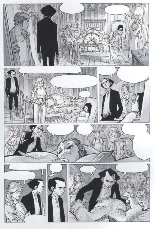 stern (5)Et au centre de cette cité, Elijah Stern, un drôle de croque-mort, intelligent, lecteur d’ouvrages classiques (Moby Dick, Victor Hugo…), solitaire, introverti, à la silhouette frêle et à la coupe de cheveux ressemblant aux ailes d’un corbeau. Habitant et travaillant à côté du cimetière, à la lisière de Morrison, il se déplace dans une vieille carriole, dernier véhicule des défunts. D’une belle prestance, il est invité à venir chez les Bening, après la mort de Charles dans le bordel de la ville. Sa veuve, membre de la ligue de tempérance (ligue contre alcoolisme) demande à Stern de pratiquer une autopsie sur le cadavre de son mari : elle pense qu’il n’est pas décédé de mort naturelle (crise cardiaque due à son amour des bouteilles). Alors que le médecin ne veut pas effectuer cette manipulation, le croque-mort contre quelques billets, accepte. Il découvre que le poumon de l’homme est trop foncé : il serait donc mort par asphyxie.