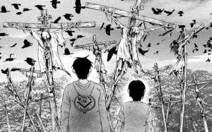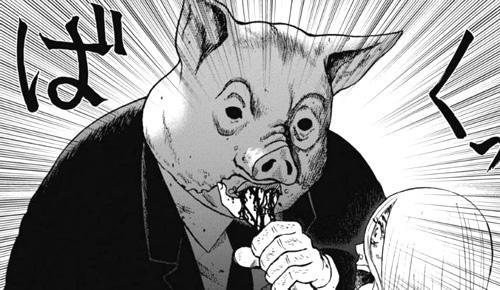 Higashiyama, dont le père est propriétaire du magnifique bateau, plonge pour rejoindre la plage parce qu’il pense que l’homme est un naufragé. Mais, l’homme à la tête de cochon ne l’accueille pas de la meilleure de manière : il le frappe à mort. Sur le navire, c’est la stupéfaction. Obligés d’accoster pour récupérer leur ami, les autres membres sont tétanisés. Takaku découvrant même des fûts contenant des matières nucléaires au fond de la mer.