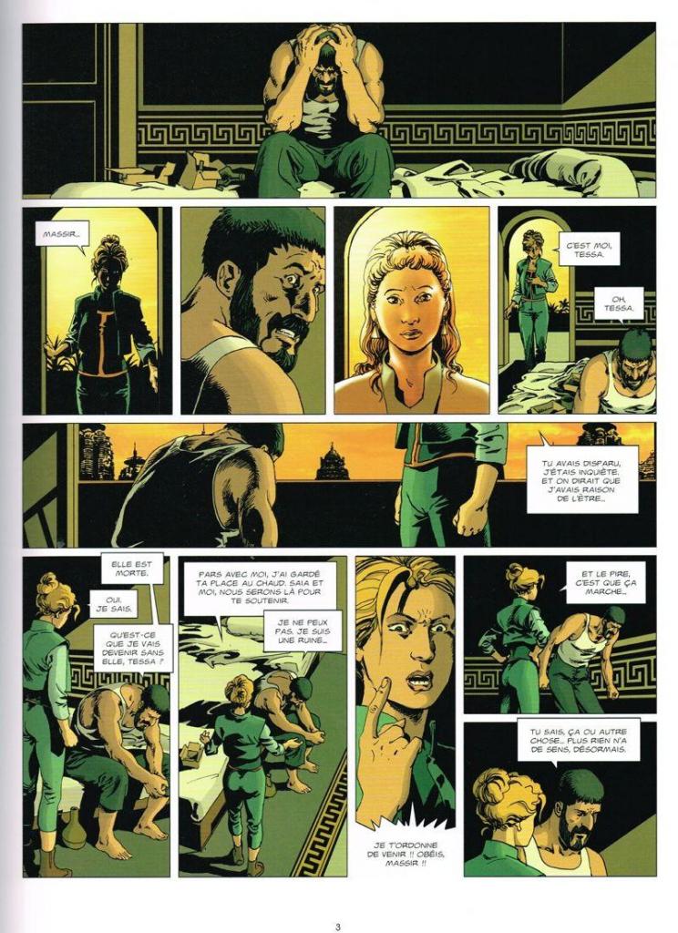 Du côté des deux héros, Massir, quinquagénaire viril et ténébreux, est toujours aussi bouleversé par la mort de sa femme. Jolt, quant à lui, se rapproche de son commandant, l’effleurant jusqu’à une pulsion physique, comme le veut d’ailleurs leur société calquée sur l’Antiquité grecque. Du côté du graphisme, Etienne Le Roux donne la pleine mesure de son talent. Revenant à ses premières amours (Amenophis IV, avec Dieter et Hubert, chez Delcourt), il propose des planches d’une belle lisibilité, composées de grandes cases. Son trait rétro et très soigné est idéal pour conter des histoires de science-fiction.