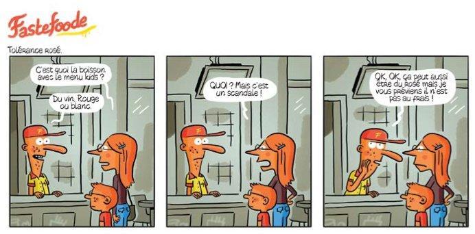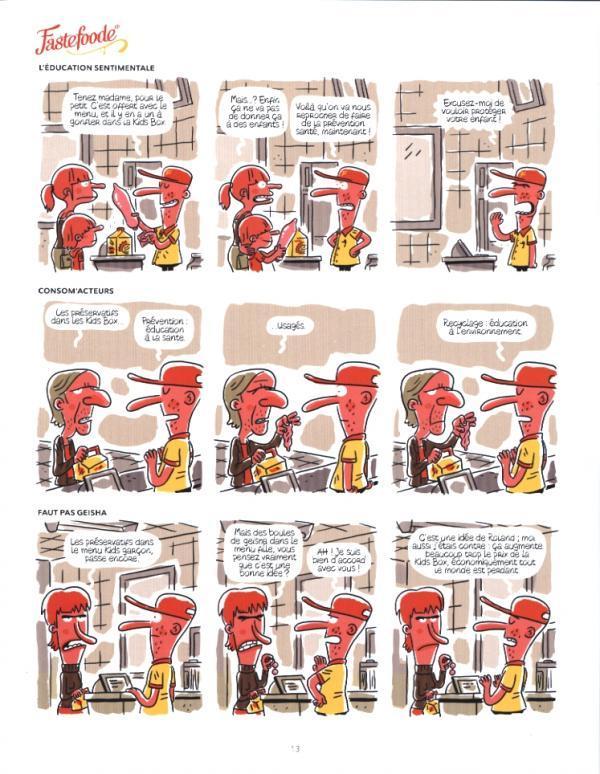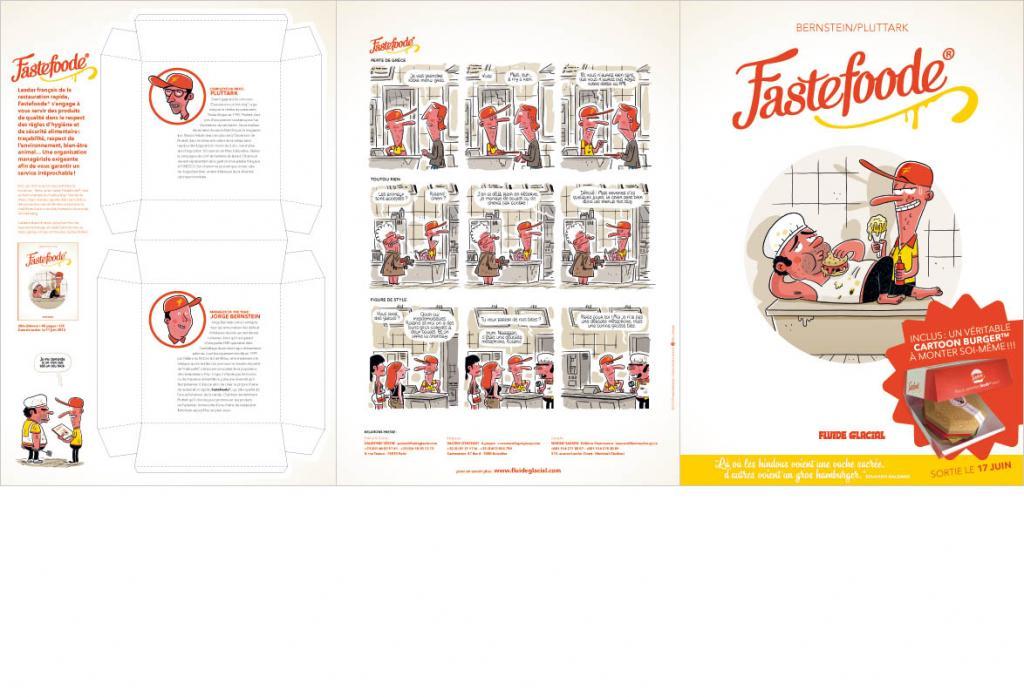 Service déplorable, aliments immangeables, saleté, compromissions, blagues vaseuses, drague de mauvais goût, box pour enfants aux jouets douteux : tout est réussi pour ne plus remettre les pieds chez Fastefoode, pourtant chaîne leader de restauration rapide. Composé de strips en trois cases, l’album enchaîne les gags en fustigeant ce qu’il peut y avoir de pire dans un fast food. Jorge Bernstein imagine deux personnages crétins, pas très futés et à la limite de la vulgarité, et ça fonctionne presque à chaque fois : Roland, le cuisinier, sale, gros et méchant dont les hamburgers sont indigestes et le serveur gaffeur, gros lourdau lorsqu’il drague et ayant réponse à tout.