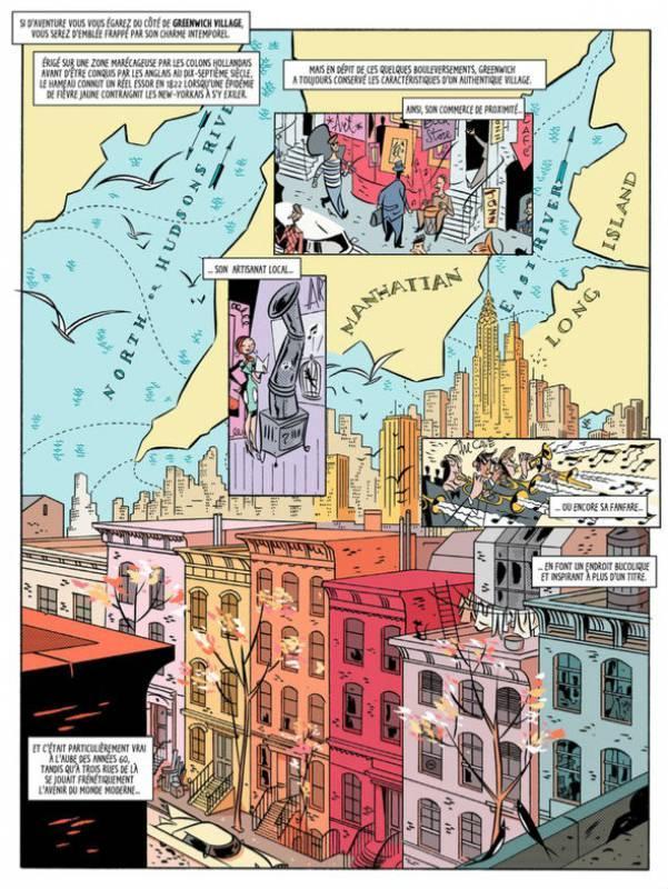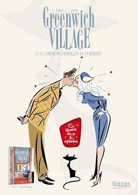 Dès les premières pages, leurs relations font des étincelles : la jeune femme se trompe d’appartement pour son emménagement. Les soirées tardives, la musique à fond et l’aspirateur, tout cela énerve le pauvre Norman qui aimerait retrouver sa quiétude perdue. Véritable Romantic trip, Greenwich Village multiplie les hommages et les clins d’œil aux années 60. Il faut dire que les deux auteurs avaient une envie folle de mettre en scène une histoire à cette période et aux USA. Admirateurs des comédies avec Rock Hudson et Doris Day, mais aussi Dean Martin ou Franck Sinatra et enfin la série télévisée Mad Men, cela leur permet d’offrir de nombreuses situations cocasses, de dialogues savoureux et de personnages caricaturaux comme dans les films cités précédemment.