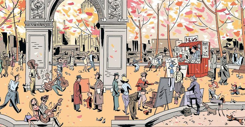 Le gros point fort de ce premier volume est avant tout la partie graphique confiée à Antonio Lapone. L’auteur joue de plus en plus avec une ligne claire formidable. Dans les pas de Chaland, Avril ou Torres, qui ont réalisé de nombreux ouvrages très sixties dans les années 80, le dessinateur italien réalise une belle performance. Du tramage à la Lichtenstein ou à la Serge Clerc pour les fonds de vignettes aux traits fins de ses personnages, tout est réussi ! L’ambiance insouciante et folle de cette période est admirablement restituée par Lapone, qui expose les planches de Greenwich Village à la Galerie Champaka depuis le 09/09 et jusqu’au 10-10-2015.